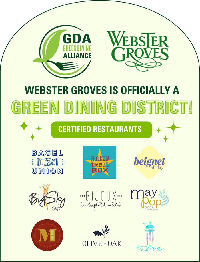 The City of Webster Groves became the St. Louis’ newest Green Dining District in June 2025. Nine GDA certified restaurants proudly call Webster Groves home! To celebrate the new district, GDA held its first Bikes and Bikes event, a five-mile cycling tour of certified businesses. Read more about Webster Groves’ commitment to sustainable dining on the city’s website.